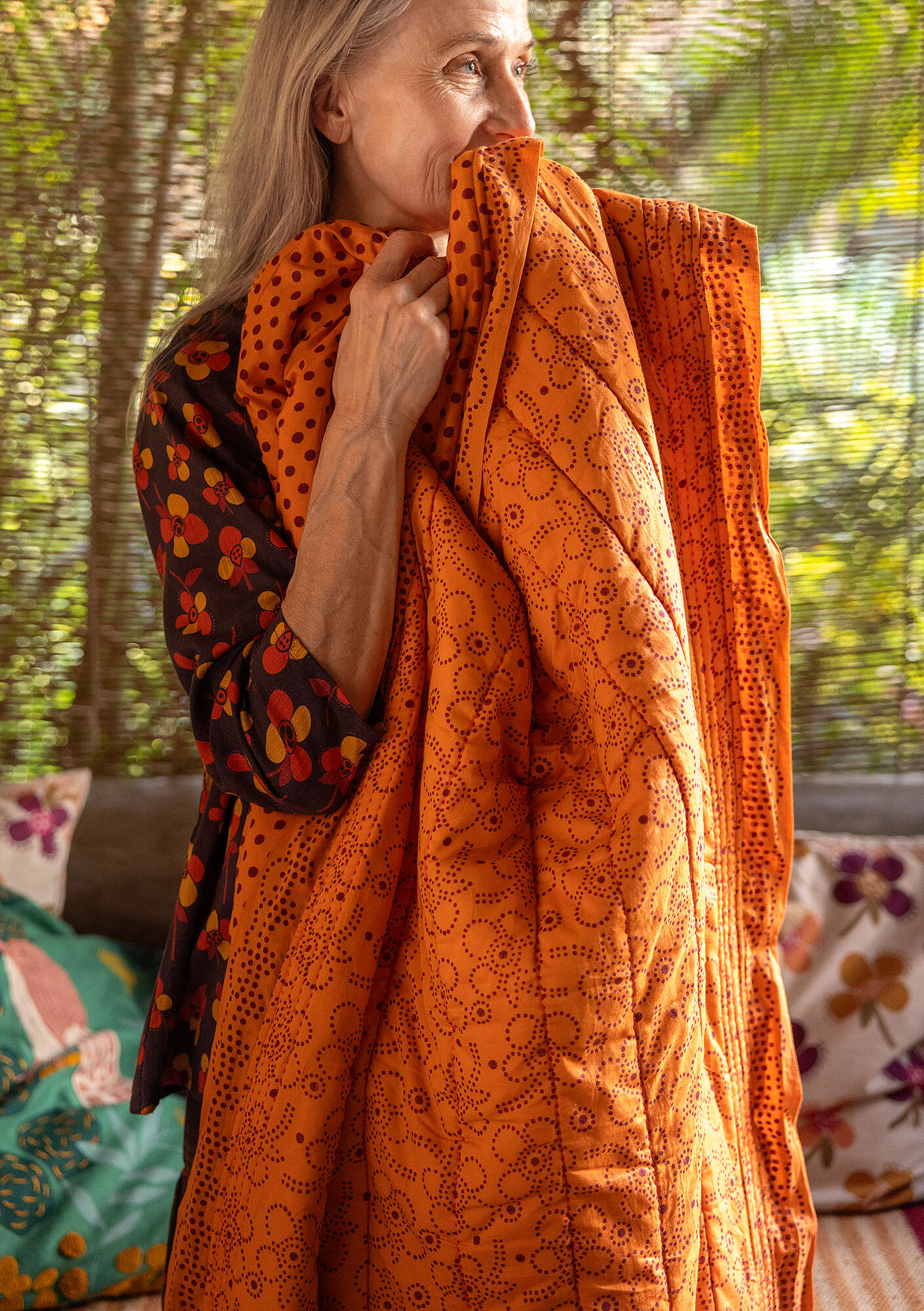 - 100% cotton. 100% cotton wadding. The cotton is certified organic. The fabric is block-printed by hand. Hand wash cold. Do not spin dry. Medium iron. Made in Bagru, India.