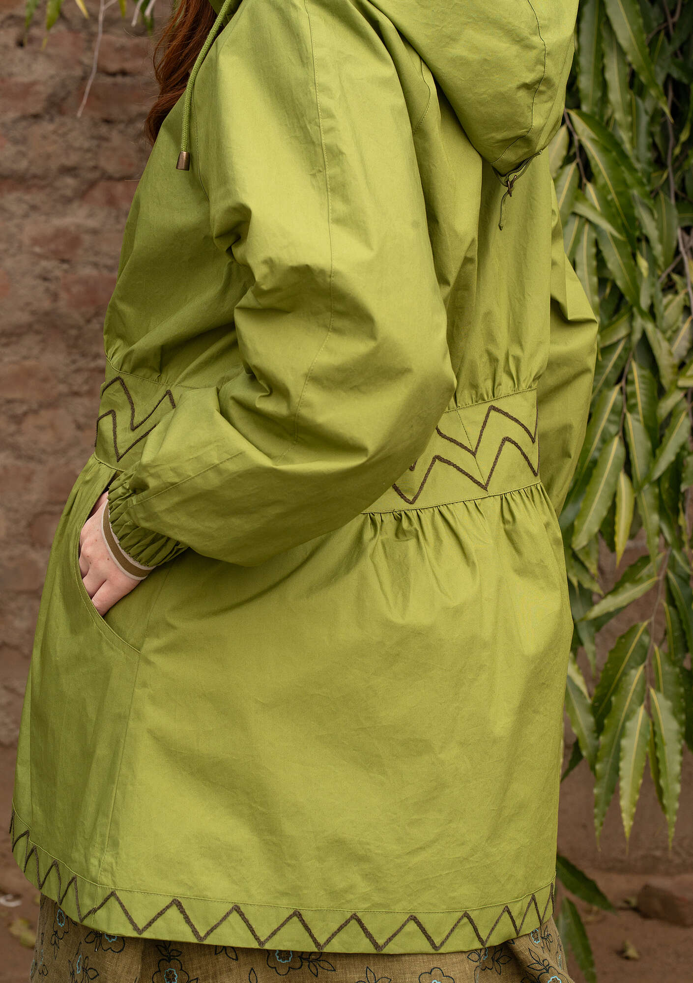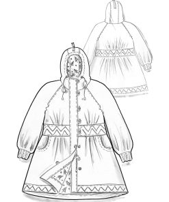 - Defined waist with beautiful tone-on-tone embroidery. Raglan sleeves with elastic at the cuffs. Zipper and buttons with loops. Practical pockets. Drawstring hood.Size and Measurement