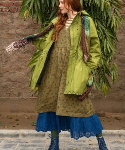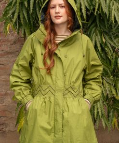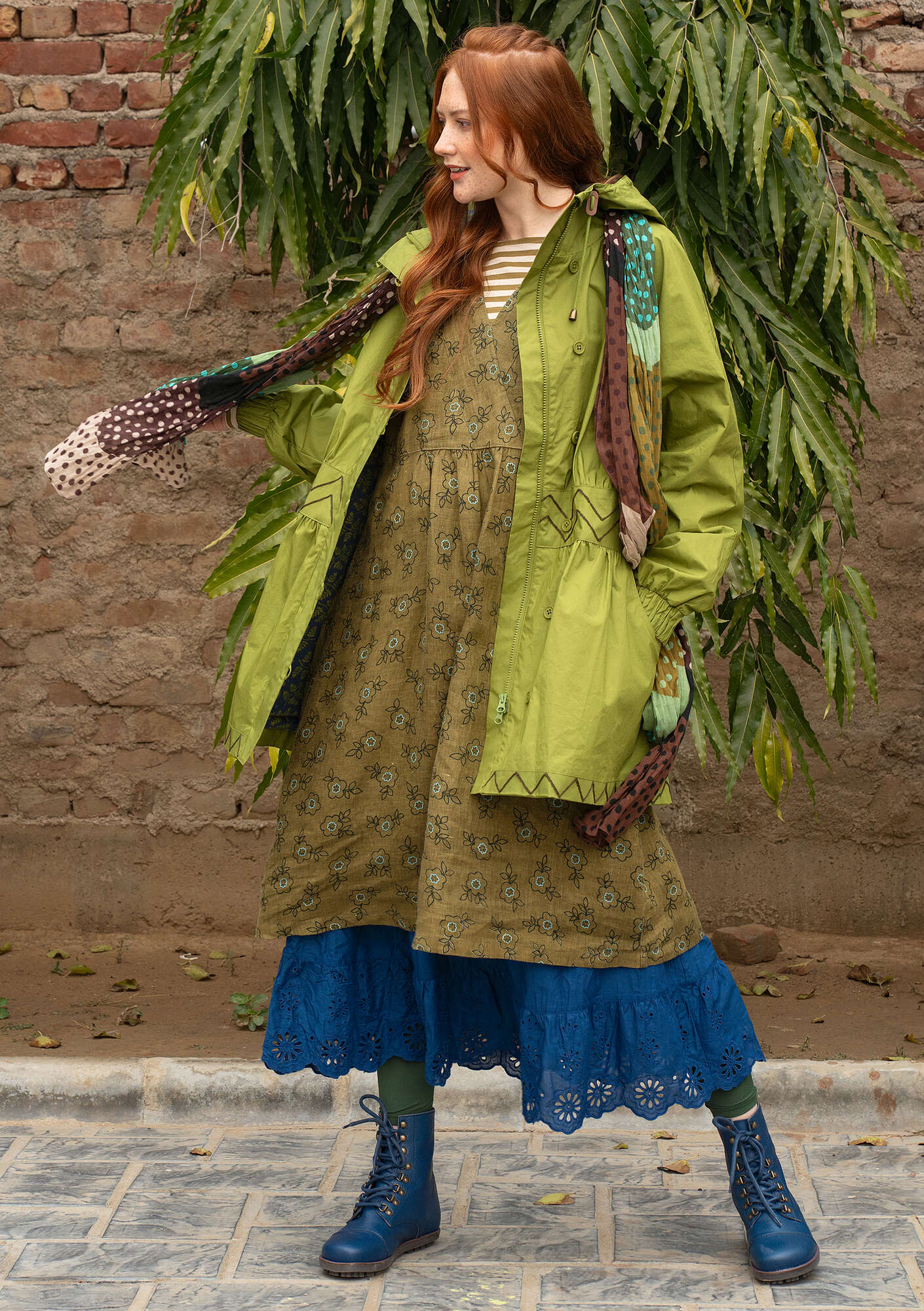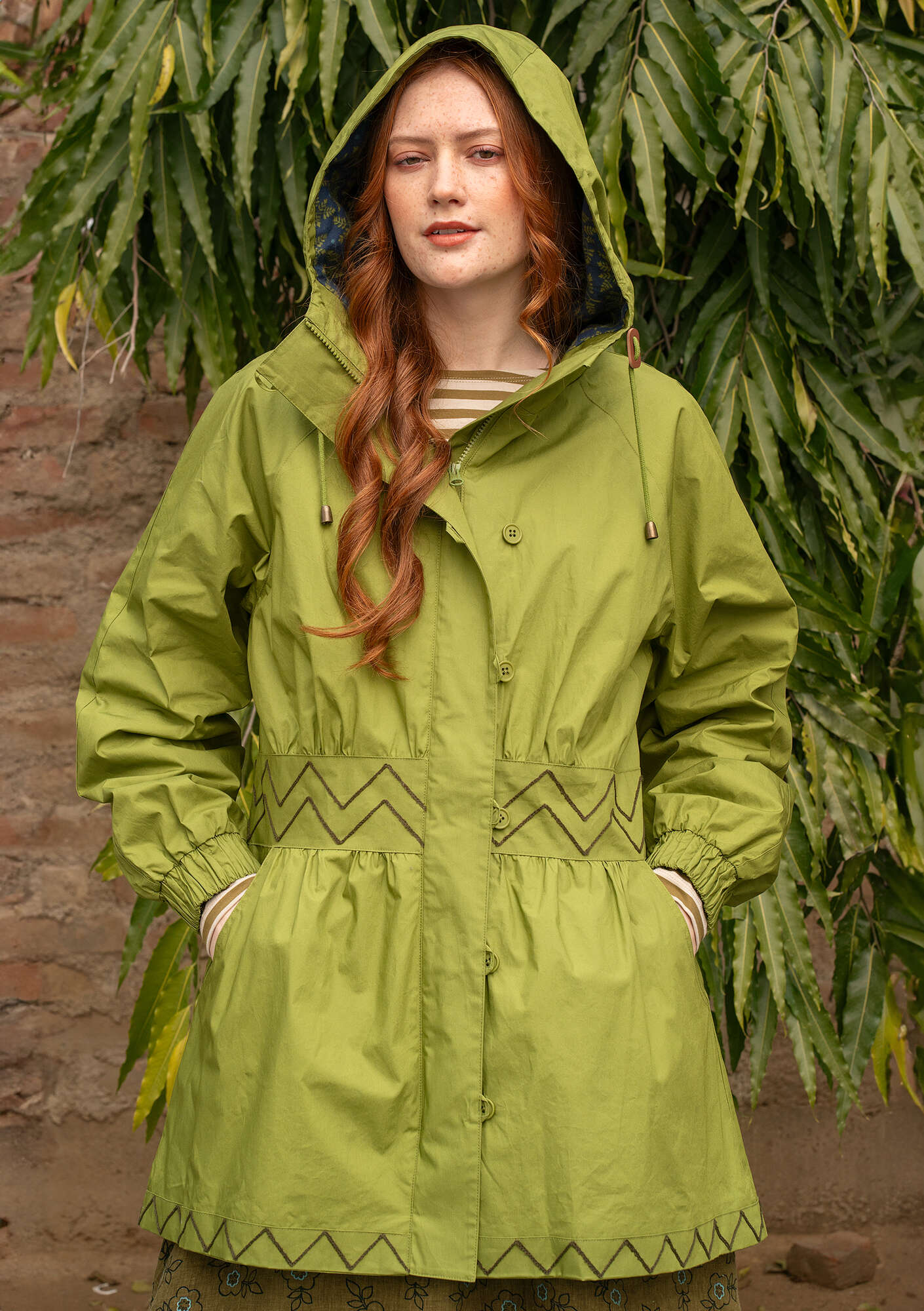 - 100% cotton. The cotton is certified organic. The dyeing process is certified. The fabric is treated with a water-repellent, fluorine-free impregnation. Cotton flannel lining. Machine wash warm, delicate cycle. Cool iron. Do not dry clean.Shrinkage 2-3%. Made in Zhejiang, China.