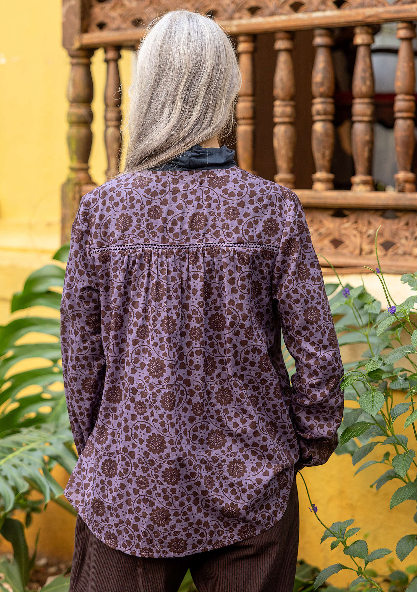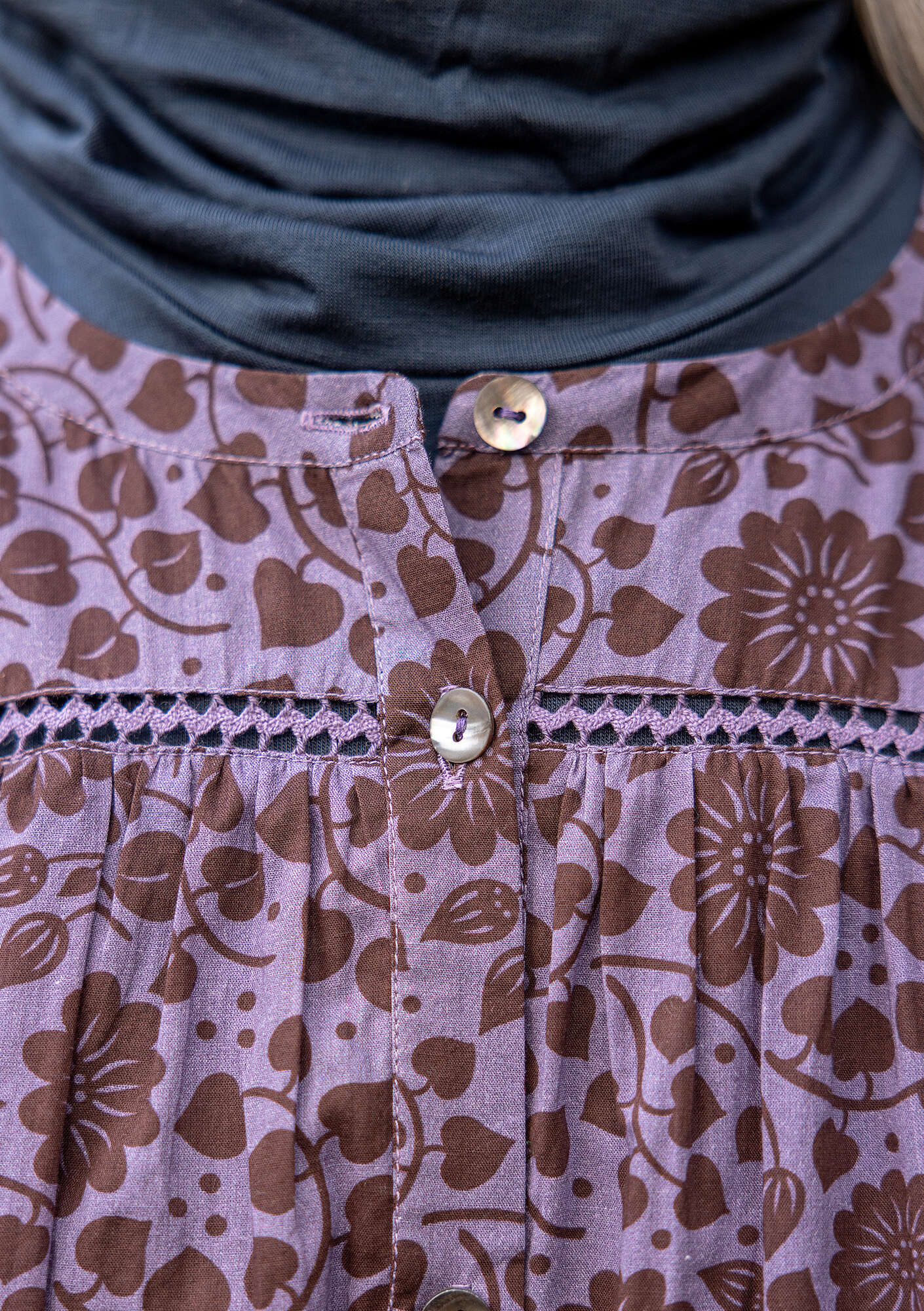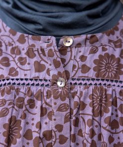 - Printed blouse in a fully buttoned style with a yoke at the front and back, and an inset crocheted band. Band collar and cuffs with trim and a button. Mother-of-pearl buttons.Size and Measurement