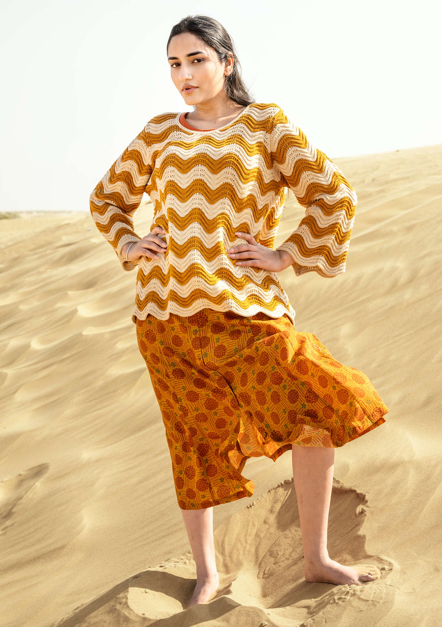 - Textured-knit sweater in a wavy pattern with contrasting edges. Three-quarter sleeves with contrasting cuffs.Size and Measurement