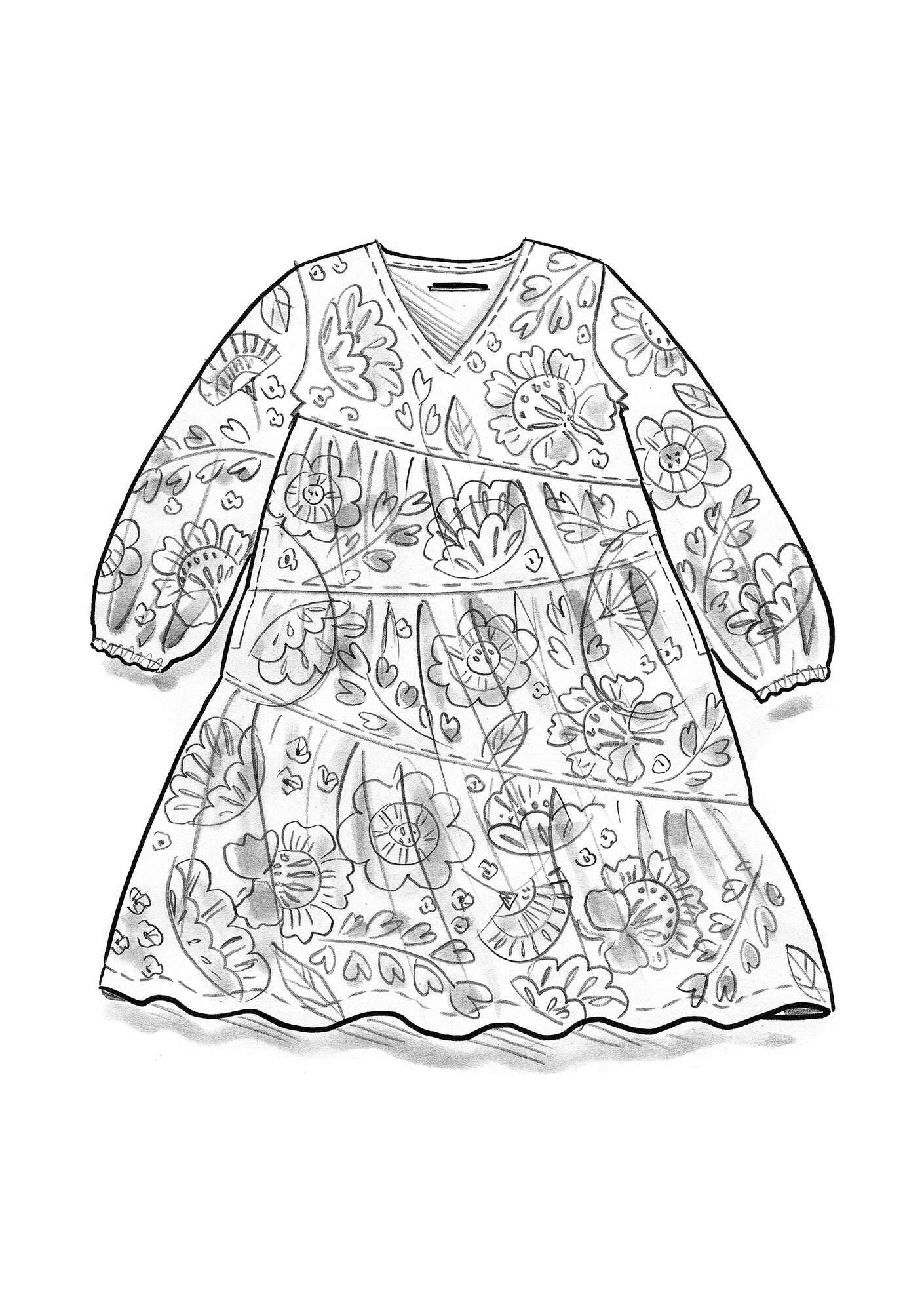 - Digitally printed dress in an exciting style. Constructed in diagonally cut panels, with the fabric direction placed on an angle. V-neck and long puff sleeves with elastic at the cuffs. Pockets at the side seams.Size and Measurement