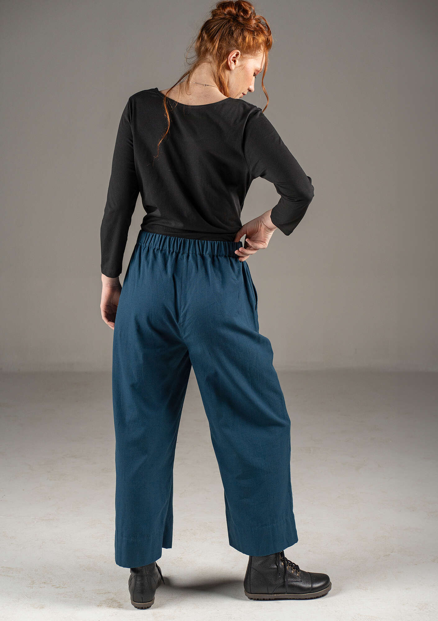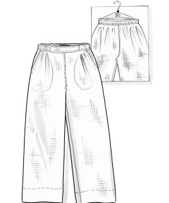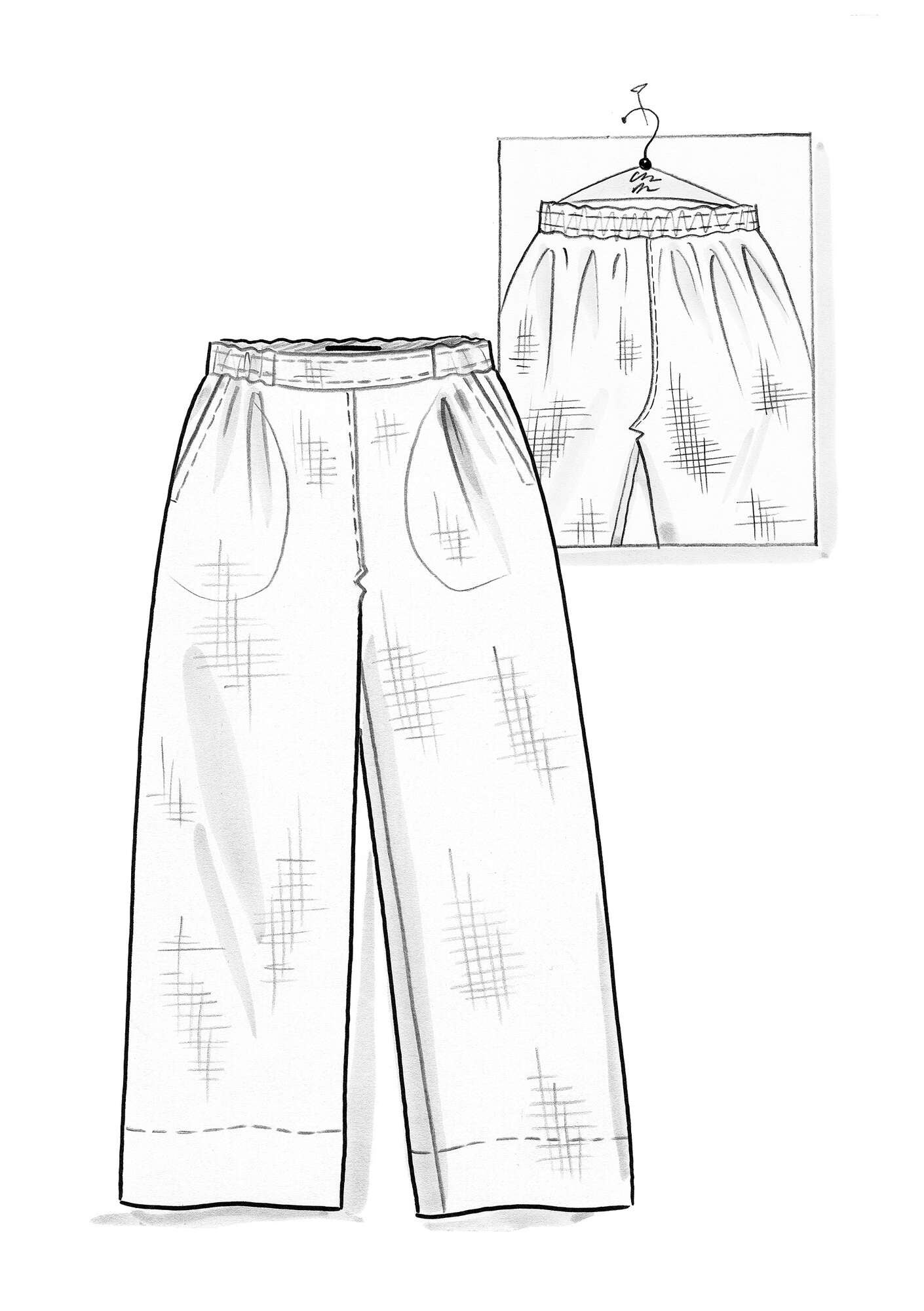 - Ankle-length style with wide hems. Practical pockets. Comfortable elastic waist with a smooth section at the front center. In this soft fabric, the seed hulls are left in the yarn as a lovely detail.Size and Measurement