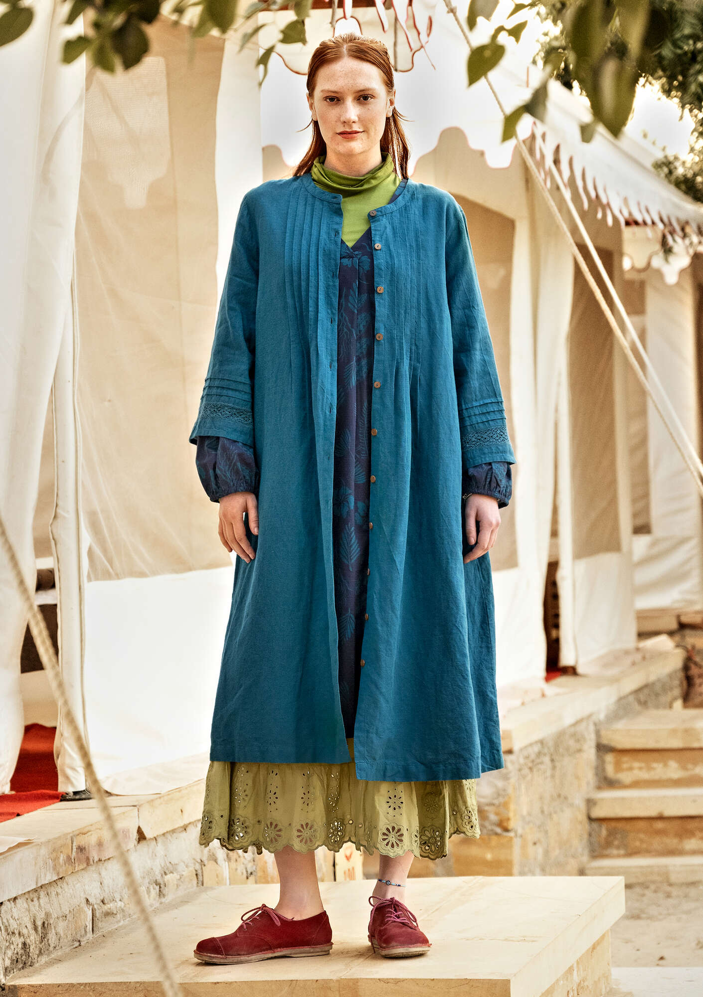 - 55% cotton, 45% linen. The cotton is certified organic. The linen is dew-retted, a natural process in which the sun and dew handle the work without chemicals and with minimal water use. The entire production chain is certified. Machine wash cold, delicate cycle. Medium iron. Shrinkage 2-3%. Made in Mumbai, India.