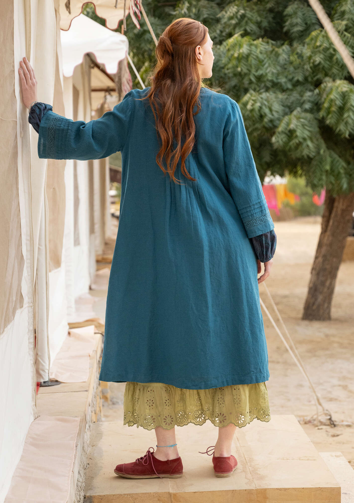 - Solid-colored dress in a beautiful linen blend. Pintucks at the top on the front and back, giving the garment plenty of volume toward the hem. Side pockets and three-quarter sleeves with inset lace. Natural-colored coconut buttons.Size and Measurement