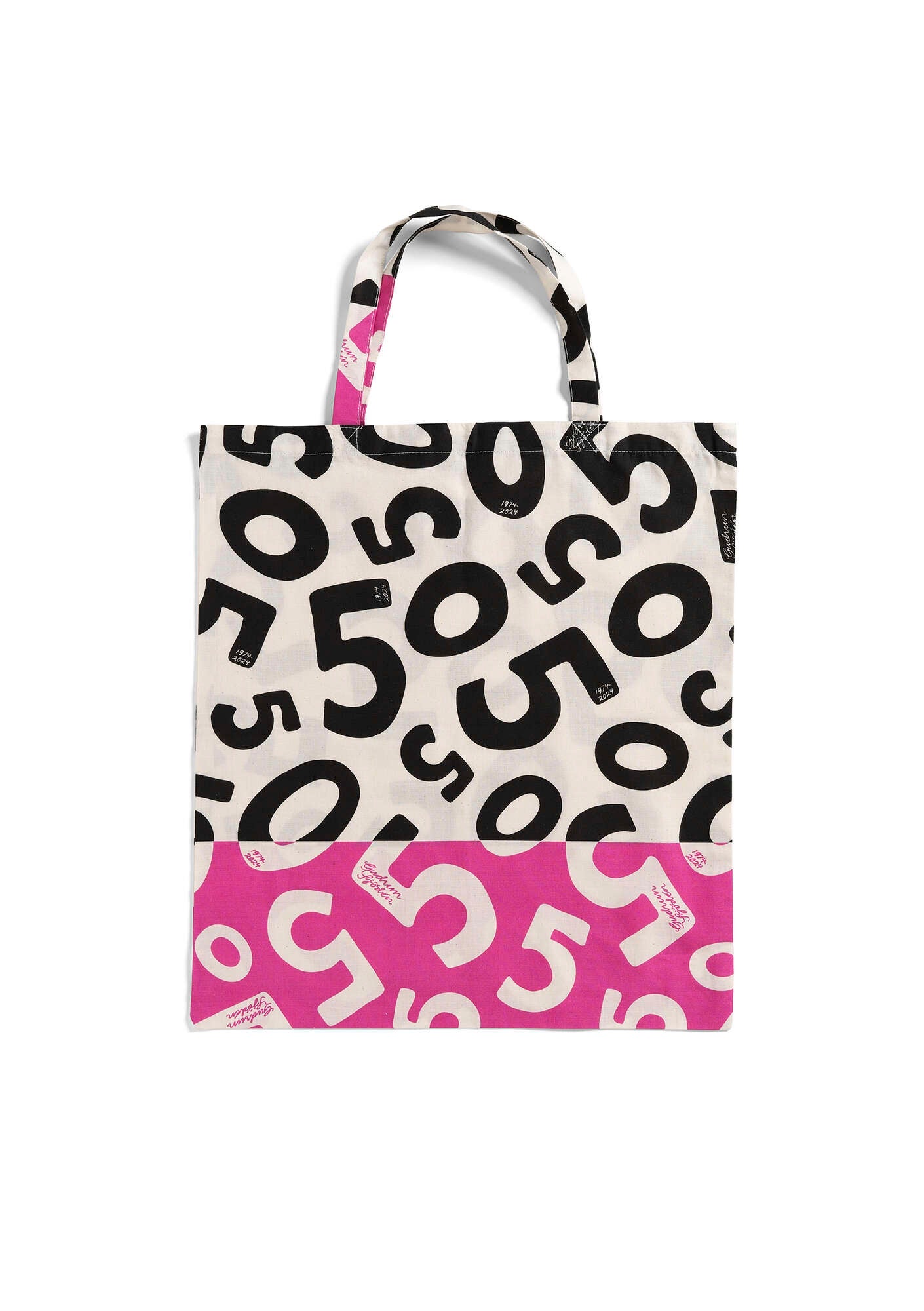 - Fabric tote bag with a printed pattern of numbers in celebration of the 50-year anniversary of Gudrun Sjödén. Square style, with two handles.Size and Measurement