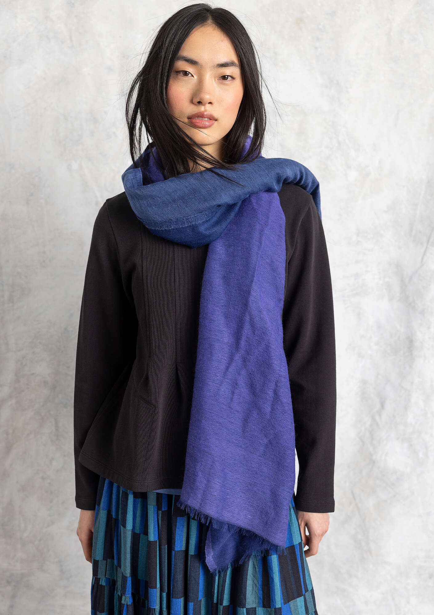 - A color-block shawl in soft and supple wool. The double-sided satin weave allows us to make this shawl with different colors on either side. A playful combination of colors.Material and Production